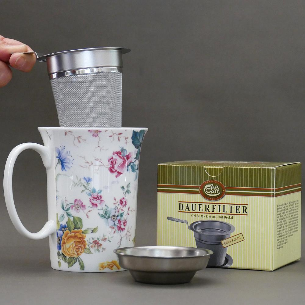 In stock Filters Medium black tea filter with cup/lid (2 handles) Teeli TE-421.00.00 CHF12.50 Very practical, simple to use "Teeli" filter with a very fine mesh. It leaves the tea the space it needs to develop perfectly. The lid also serves as a saucer for the filter after use. For cups/teapots at least 6.5cm wide and 7.5cm deep. Maximum cup width 9.5cm