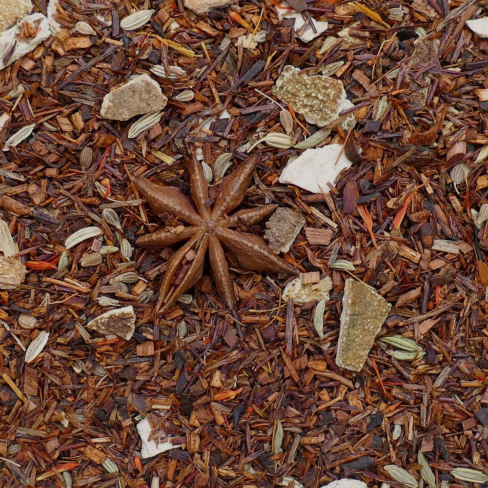 Make your teapot sparkle! This blend of rooibos and honeybush shines with a thousand warm and spicy Christmas flavors. Infusion based on South African rooibos and honeybush from controlled natural production, pieces of cinnamon, orange, sweet fennel, licorice, anise seeds, star anise, safflower and natural flavors.