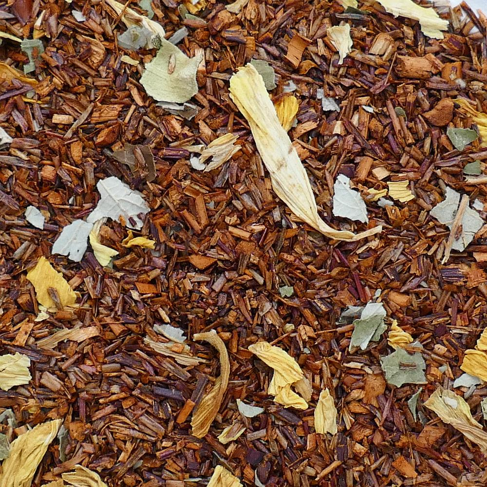 Un goût qui vous rappelle qu’un moment de détente est toujours bienvenu. Ce rooibos se fond d’exotisme dans les délectables saveurs douces et fraîches de mangue et d’ananas. Infusion à base de rooibos d’Afrique du Sud de production naturelle contrôlée, morceaux d'ananas, de mangue, feuilles de mûrier, pétales de tournesol et arômes.