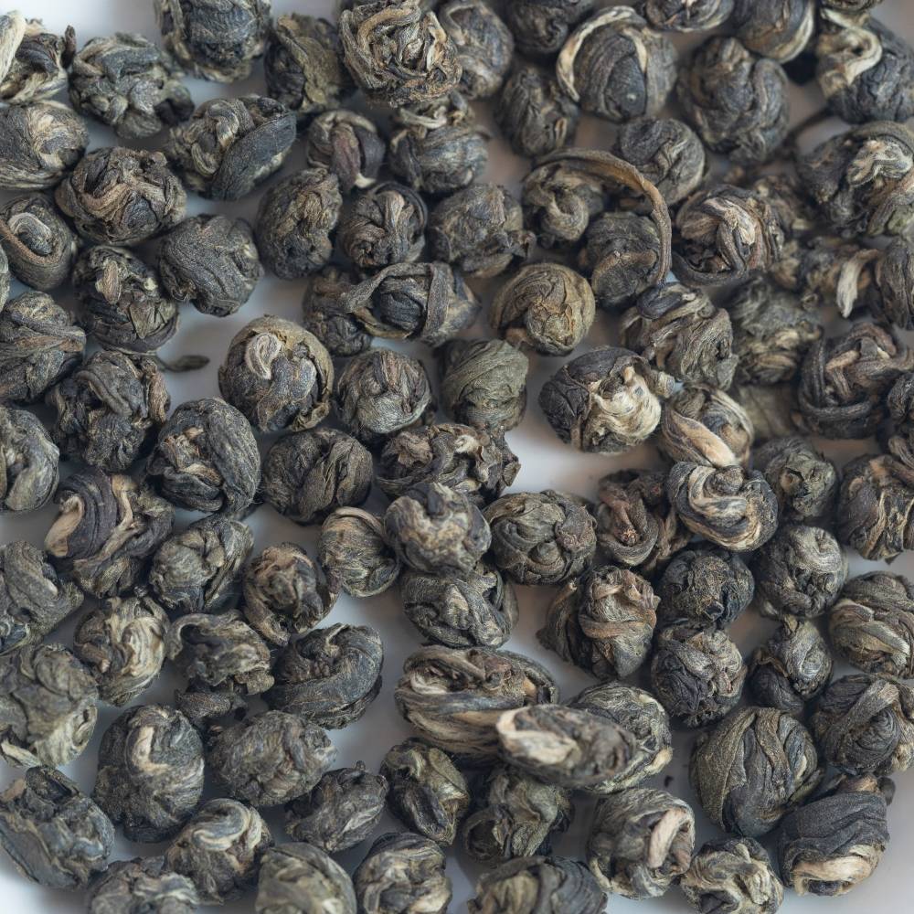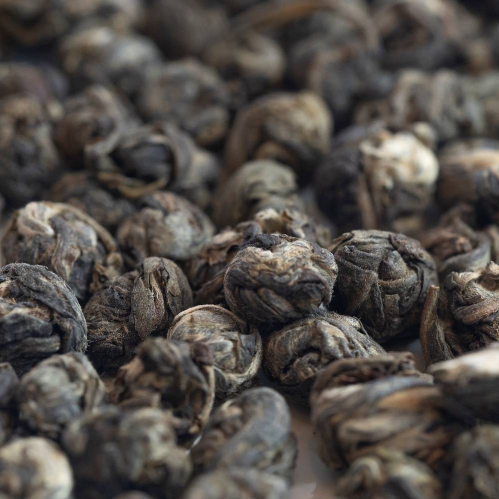 Réveillez le parfum mythique de la Chine. Perle du Dragon au Jasmin est élaboré sur une base thé vert chinois d'excellente qualité. Les bourgeons ainsi que des deux feuilles suivantes du théier sont roulés ensemble en perles qui s’ouvrent avec élégance à l’infusion. Son parfum de jasmin est très doux et accompagne admirablement le charme délicieux de ce thé.